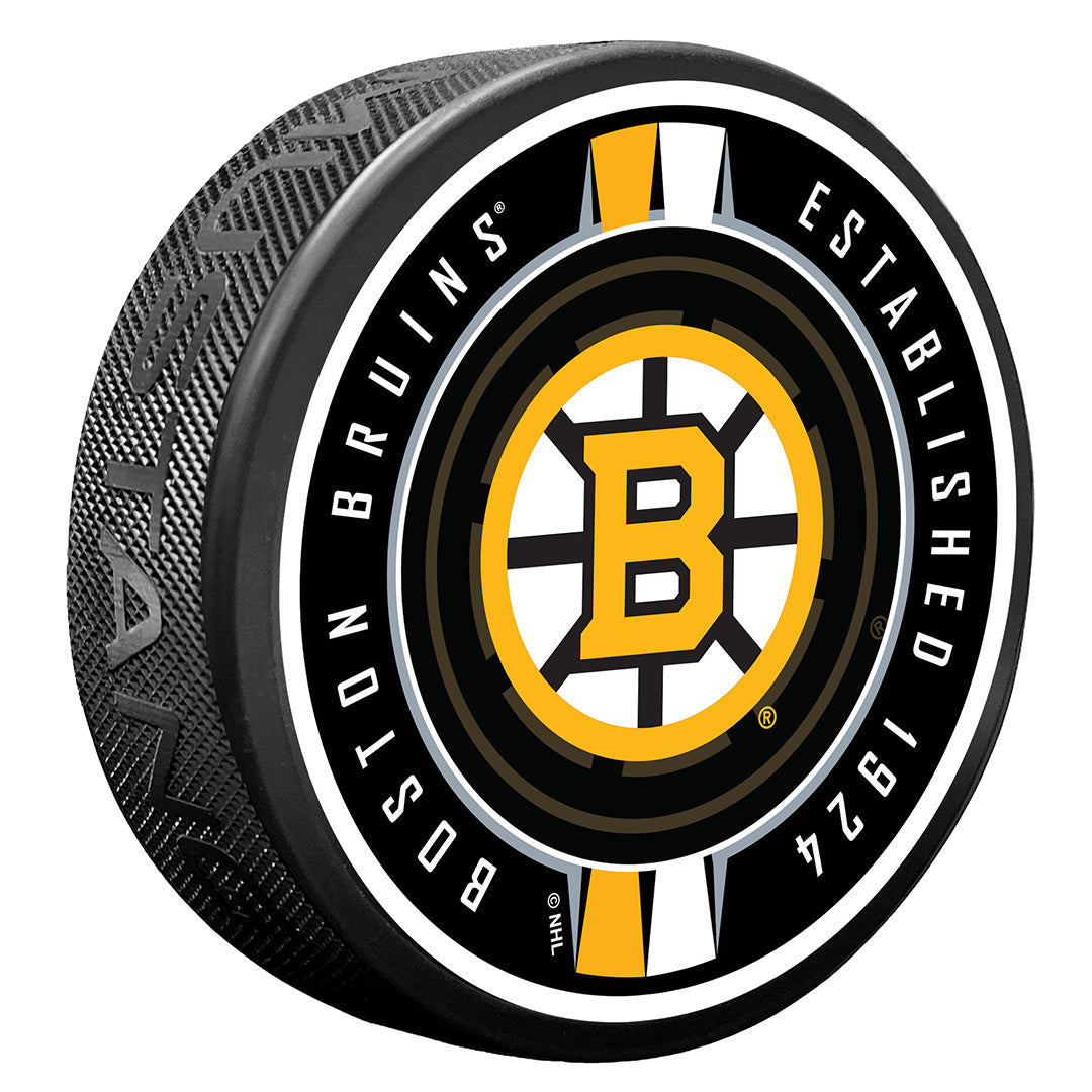 Get your puck game on point with the Ribbon Boston Bruins puck. This puck has a ribbon design with team colors design, making it the perfect addition to your collection.