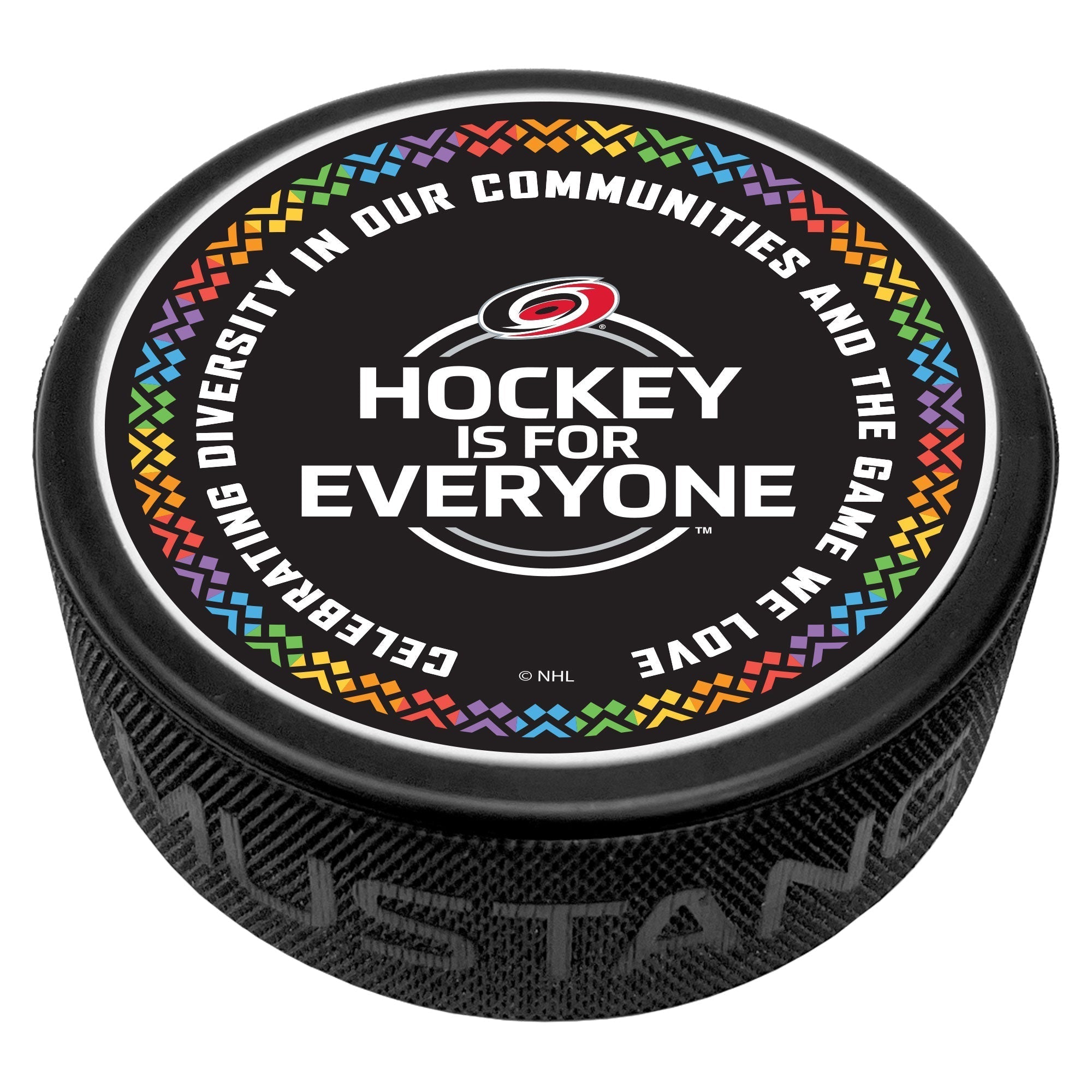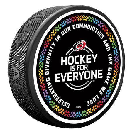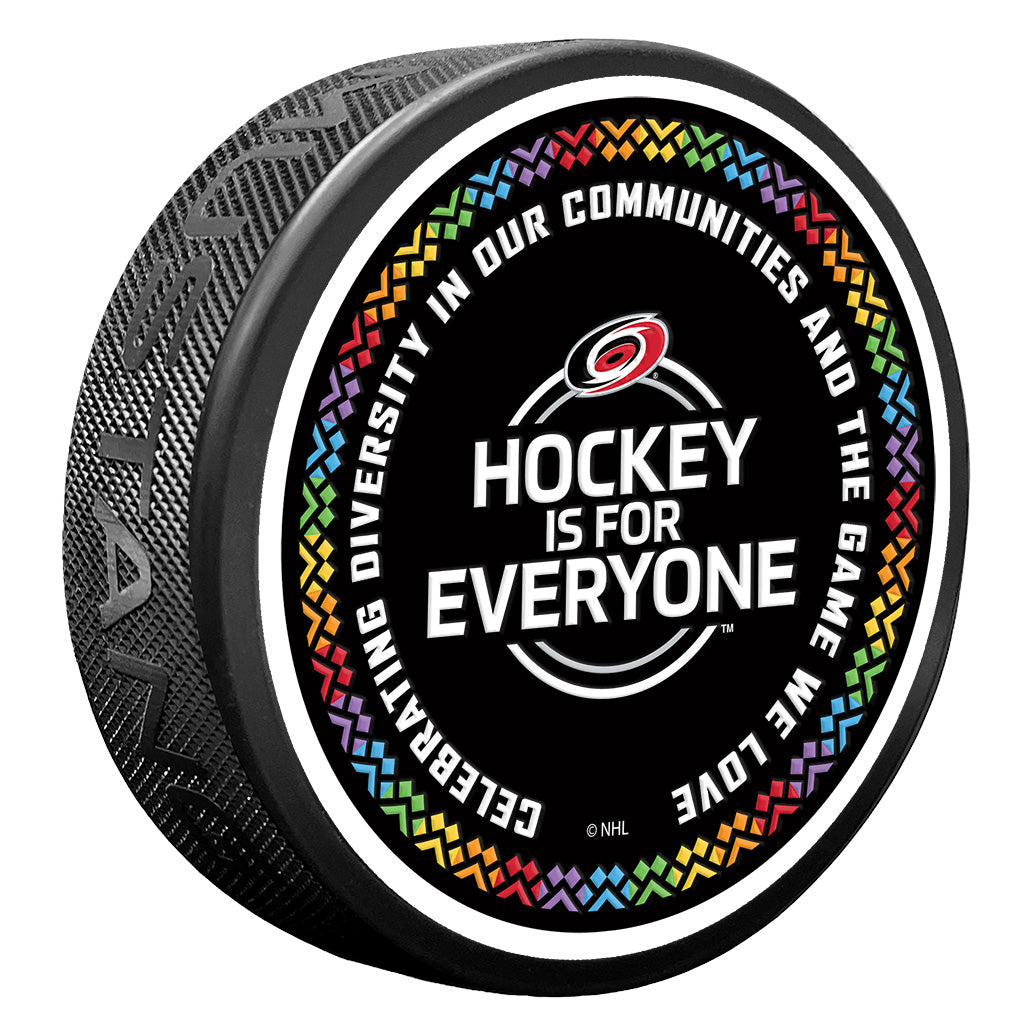 Hockey is for Everyone™ uses the game of hockey to drive positive social change and foster more inclusive communities. This Hockey is for Everyone Carolina Hurricanes puck represents just that.