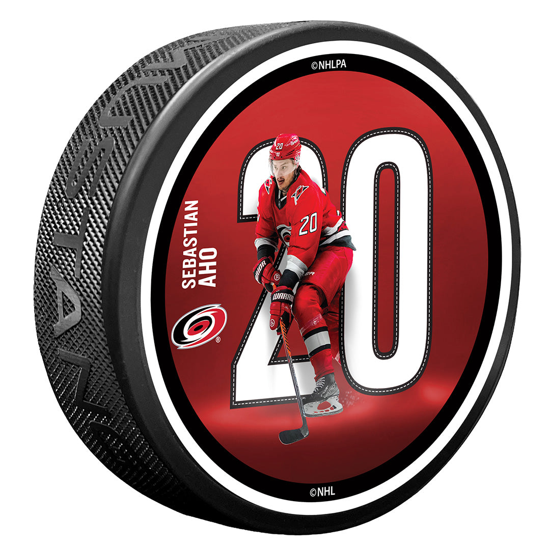 The puck features an image of Aho breaking through his jersey number. The stylish design features the Carolina Hurricanes team colors and logo. The 3D engraving adds texture that you won’t find with just a regular printed puck, making this a stand-out in your collection!
