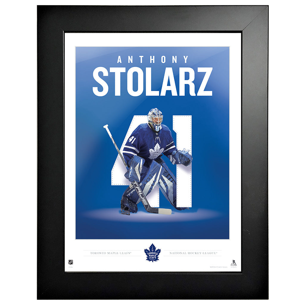 Show off your Toronto Maple Leafs pride with this sleek framed Stolarz player print. Featuring bold graphics of Stolarz in action alongside his name and number 41, this officially licensed NHL collectible is the perfect addition to any fan cave, office, or game room. The vibrant Toronto blue background and crisp presentation make it a standout piece that highlights your favorite goalie.